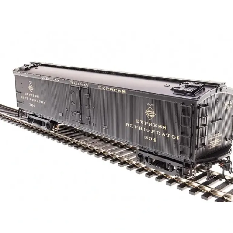 This is a Broadway Limited 1824 HO Scale American Railway Express General American (GACX) 53’6 Wood Express Reefer – Ready to Run #304 (Pullman Green). It features a plastic body construction, plastic trucks with metal wheels, and operating knuckle couplers.