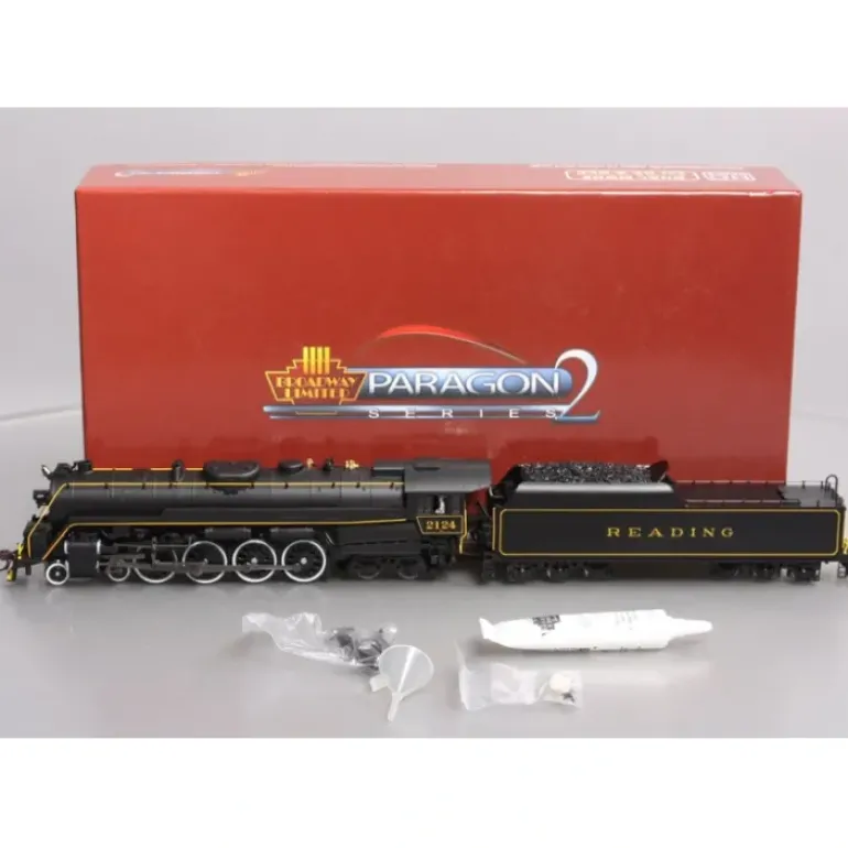 This is a Broadway Limited 2146 HO Scale Reading Class T-1 4-8-4 with Sound & DCC – Paragon2 #2124 (Iron Horse Ramble Excursion).Industry-Leading Features: All-New Paragon2 Sound & Control System,Synchronized Puffing Smoke with Chuff Sound,Variable Puffing Smoke Intensity and timing,Integral DCC Decoder with Back EMF for Industry Best Slow Speed Operation in DC and DCC,Precision Drive Mechanism engineered for continuous heavy load towing and smooth slow speed operation,5-Pole Can Motor with Skew Wound Armature,Premium Caliber Painting with Authentic Paint Schemes,Prototypical Light Operation with Golden White LED Headlight, Rear Light,Factory InstAlled Engineer and Fireman Figures,Near-Brass Caliber Detail at a Plastic Price. Product Information: ABS Plastic Locomotive Body with Die Cast chassis,ABS Plastic Tender body with Die Cast chassis,Locomotive + Tender Length (coupler to coupler): 15.7 inches,Locomotive Weight: 1 lb 6 oz.,Tender Weight: 7 oz.,Metal Kadee-compatible Couplers (2),All-Driver Drive and All-Wheel Electrical Pick-up except for pilot trucks/trailing trucks,Separately Applied Handrails, Ladders, Whistle, and Brass Bell,Operating Cab Roof Vents,Will Operate on Code 70, 83, and 100 rail,Recommended Minimum Radius: 18 inches,Accurate prototypical Sounds for the Reading T1.