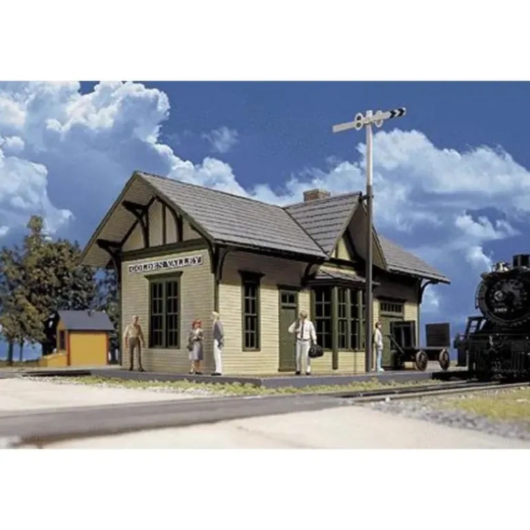 This is a Walthers 933-3532 HO Golden Valley Depot Kit. Where mainline meets Main Street you’ll find the local depot. This charming combination station (so called as it combines office, waiting room and freight room into one building) is typical of small town stations all across the US and Canada. Ideal for any era, many are still standing today. Its key features are: Parts molded in gray for easy painting Includes a positionable semaphore-style train order signal Brick platform in the traditional herringbone pattern Interior walls with molded details Wooden interior floor Baggage cart and signs