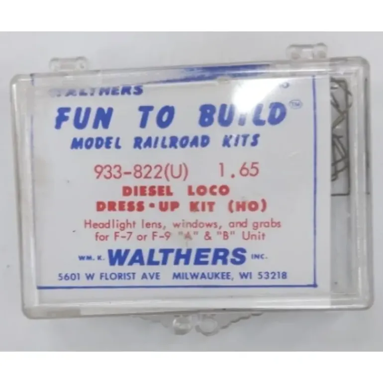 This is a Walthers 933-822 HO Athearn F7 and F9 A/B Units – Diesel Dress-Up Kit. Dress up F7 and F9 A and B units with this superdetailing kit. Designed especially for Athearn Fs, this kit contains enough parts for one A and one B unit, including clear plastic windshield, windows and port holes, preformed wire grab irons and two clear plastic headlight lenses. Complete instructions and placement diagram included.