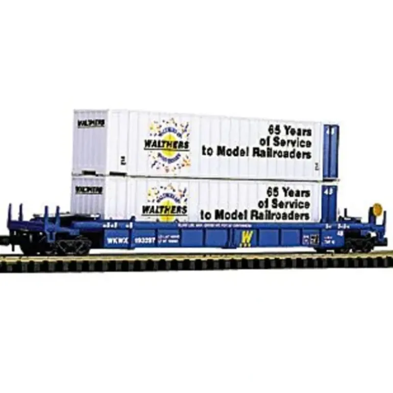 This is a Walthers 949-2 N Walthers 65th Anniversay Commemorative Car – Stand-Alone Double Stack Car. Join in the fun and help Walthers celebrate 65 years of business with these two specially dedicated Anniversary Commemorative Cars. Each ca features the decoratively colored 65th Anniversary graphics and lettering, and has a limited run to increase their collectability. The Covered Hopper also features the Lake Junction logo of the 1997 NMRA convention.