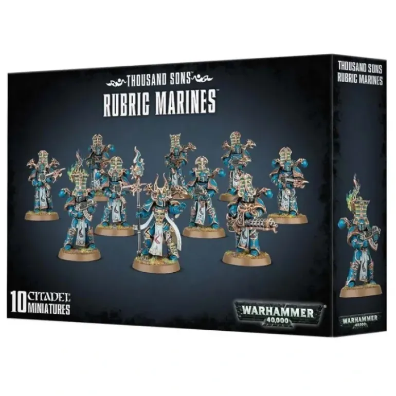 This multi-part plastic kit contains all the parts necessary to assemble 10 Rubric Marines, armed with either Inferno boltguns or warpflamers. One model can be armed with a soulreaper cannon, one can carry an Icon of Flame, and one can be assembled as an Aspiring Sorcerer, who is armed with a force stave and either an Inferno bolt pistol or warpflame pistol. Supplied with 10 Citadel 32mm Round bases.