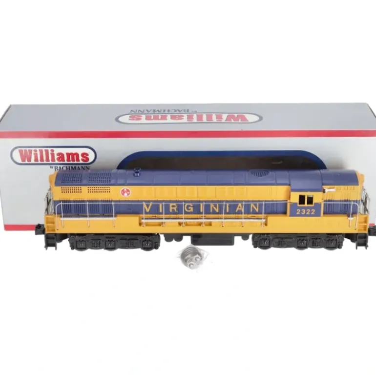 This is Bachmann 21197 O Virginian F-M H24-66 Trainmaster Deisel Locomotive. Features includes all metal trucks, die-cast truck sides, metal wheels, die-cast couplers, metal handrails, and an operating headlight. It is Lionel compatible. It navigates O31 curves. The length is 17, and the height is 4. The engine has True Blast II digital horn and bell. Painted in color yellow and blue.