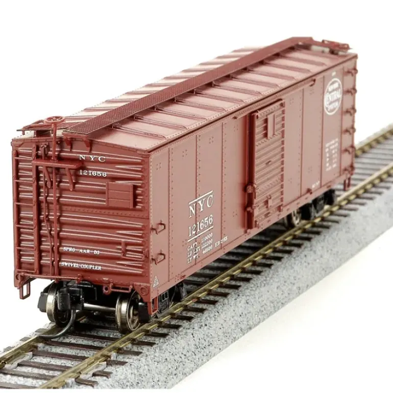 This is a Broadway Limited 1752 HO Scale New York Central NYC Specification 486 40′ Steel Boxcar Dreadnaught Ends (4) (Boxcar Red, Pre-1955 Roman Lettering). Product Information: Beautifully detailed, accurate steel side box cars,Authentic design, paint, and color schemes,Many separately applied details including hand grabs, brake components and other piping,Detailed underbody and AB brake system,Body composition: ABS plastic,Chassis composition: die cast metal,Wheel composition: die cast metal,Couplers: (2) operating knuckle couplers,Recommended minimum radius: 18 inches.